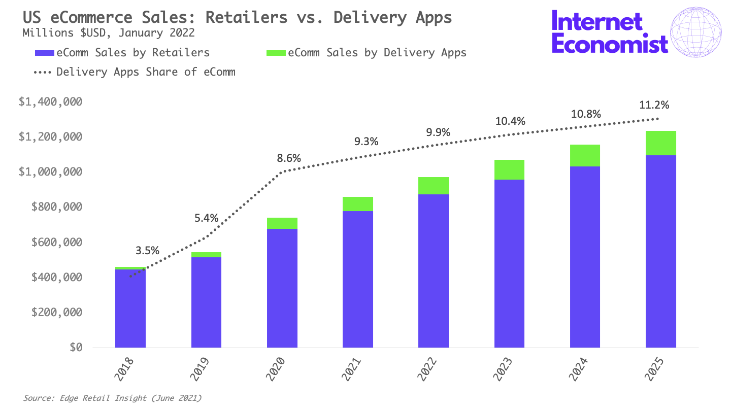 Delivery apps will account for 10% of US eCommerce sales by the end of 2022.